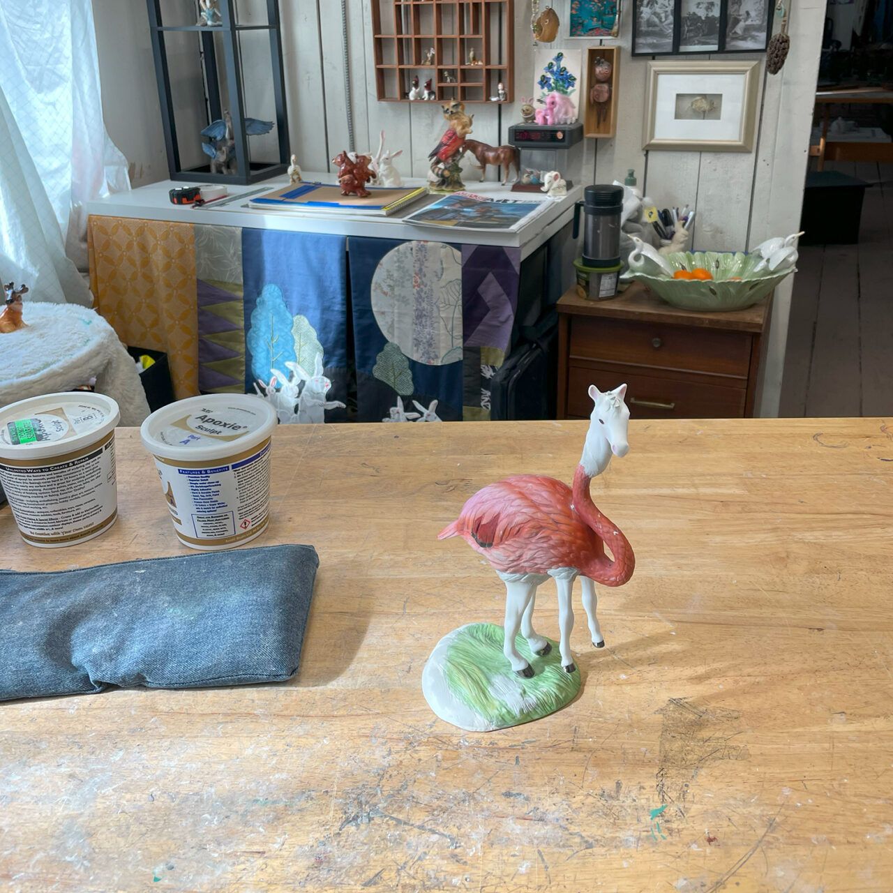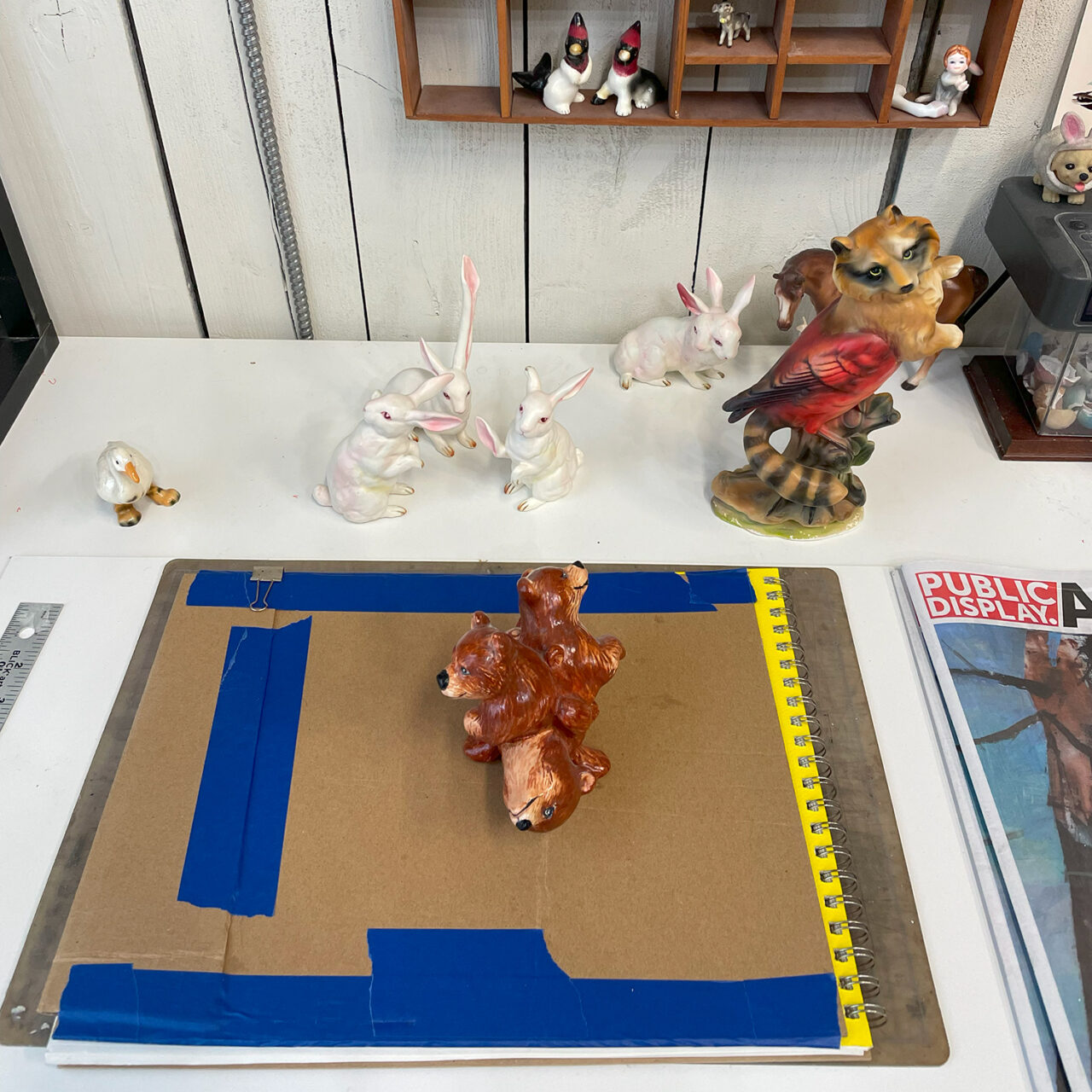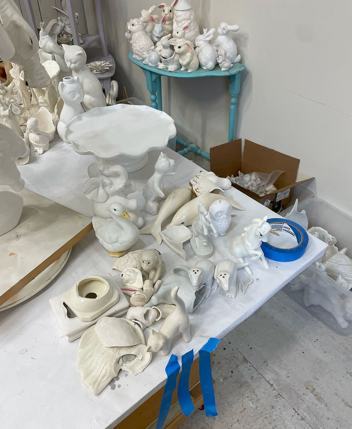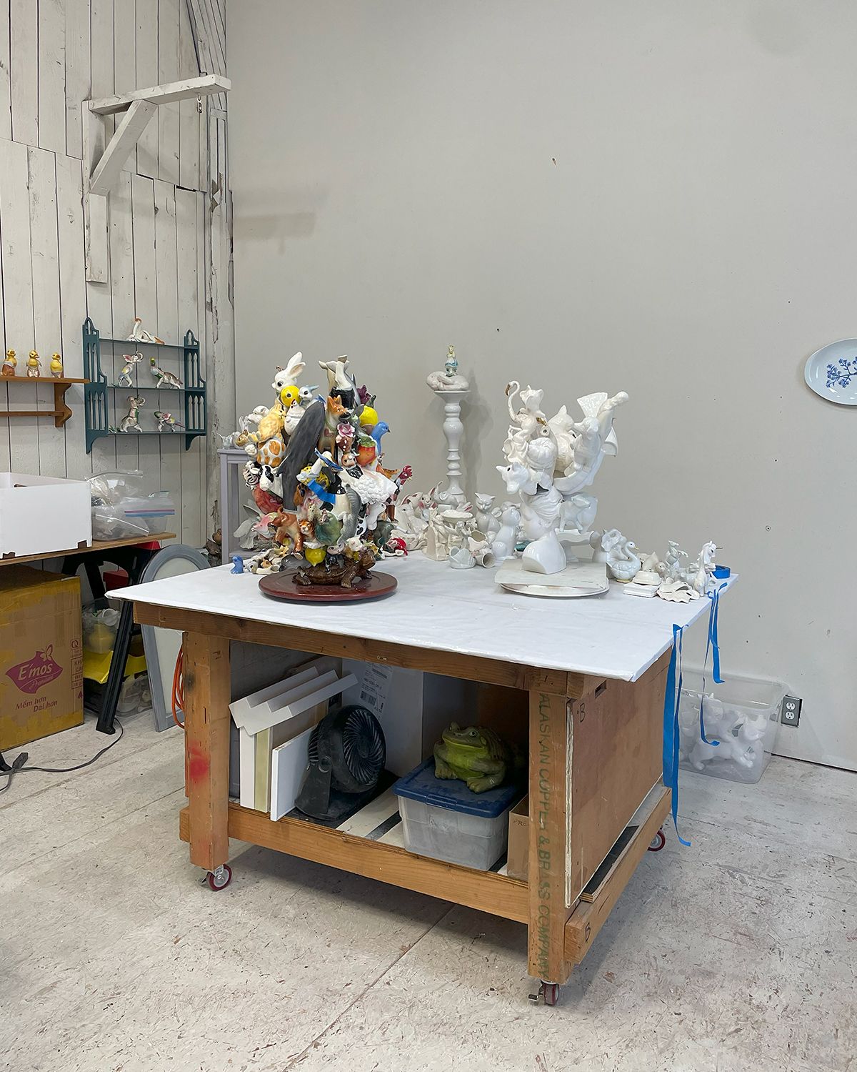 Meet Debra Broz! Debra collects and deconstructs secondhand ceramic kitsch figurings, then combines them into reimagined versions of their former selves. Using ceramics restoration techniques, she effaces history by creating seamless reconstructions that are part humor, part mad science, and part tender sentimentality for the rural Midwest where she grew up. In preparation for her upcoming Exhibition EARTHLY/UNEARTHLY alongside Tesla Kawakami, we recently visited Debra’s studio.