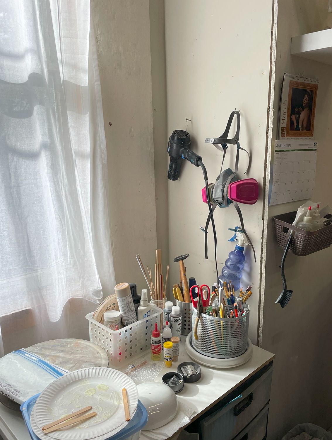 Apoxie Sculpt (the 2-part sculpting compound I use to combine ceramics) is probably number one, but there’s all these other essential tools, like wooden popsicle sticks, toothpicks, blue tape, these particular small cups I love for paint-mixing, and this one random plastic sculpting tool that I absolutely love… there’s so many things! It’s hard to pick just one.