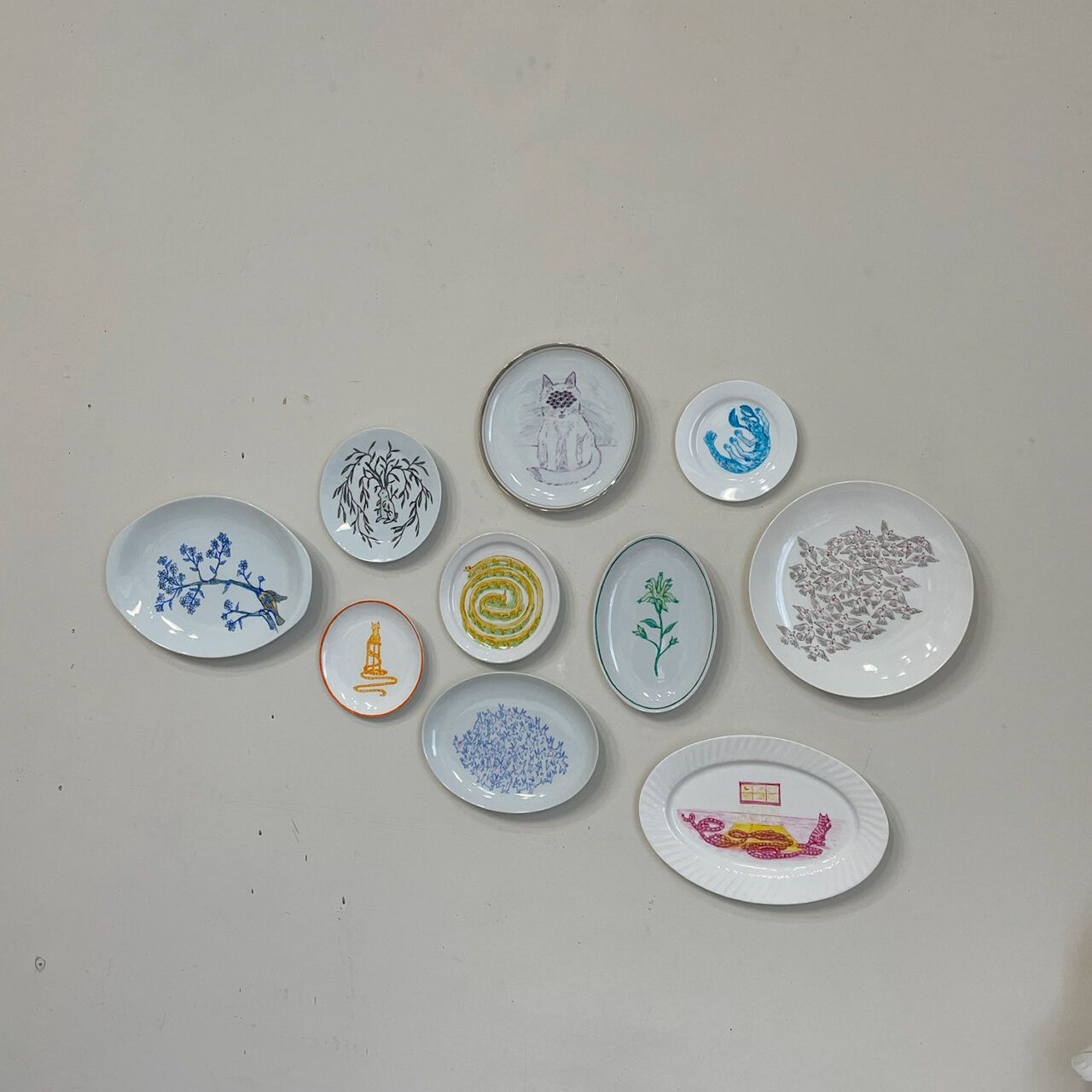 I recently started making drawings with porcelain paints on plates from the thrift store. It’s been something I do at home, and try not to be precious about the outcome so it’s been a really fun thing to do outside of my regular studio work.